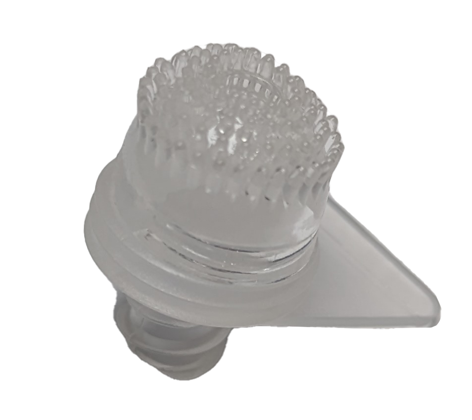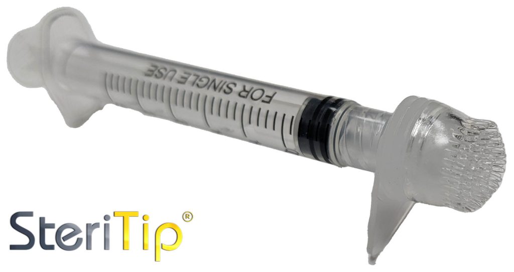 To use SteriTip® mini with a product already drawn up into a syringe, simply remove the SteriTip® from the sterile packaging and attach the preloaded syringe. Place the soft applicator on the skin and depress the syringe slowly to express product. Use the soft projections to place the product exactly where you want it and to uniformly spread it onto the skin.